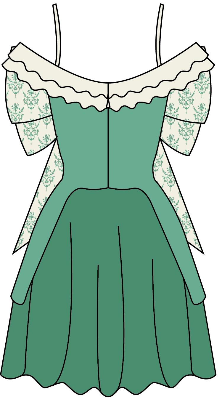 The top is a two layered high to low type of mini dress that has a corset like structure that snaps in the front. It has an off the shoulder neckline with two layers of white ruffles. on the back is a large green double bow with an ornate textile pattern to mimic fairy wings.