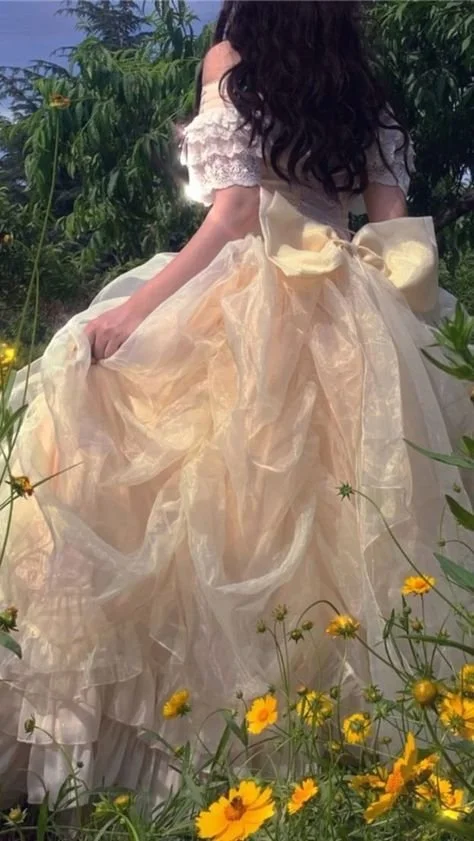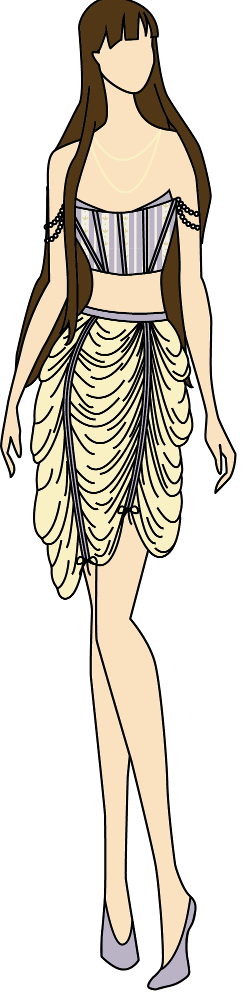 The skirt is a pale yellow tiered and draped skirt. In both the front and back there are two drawstring channels that allows for the length to be adjusted. The waistband and the channels along with the ribbon inside are the matching light purple.