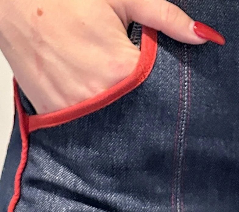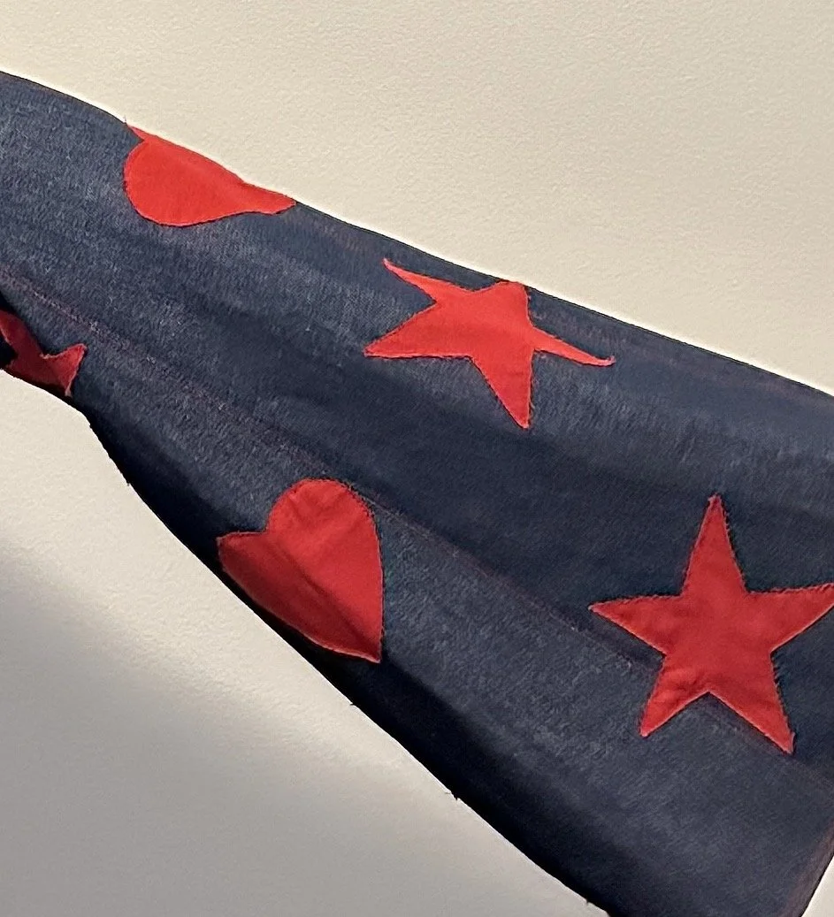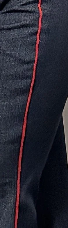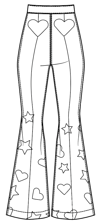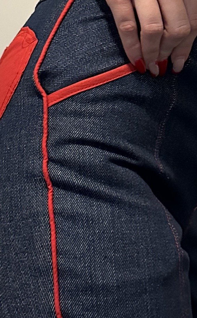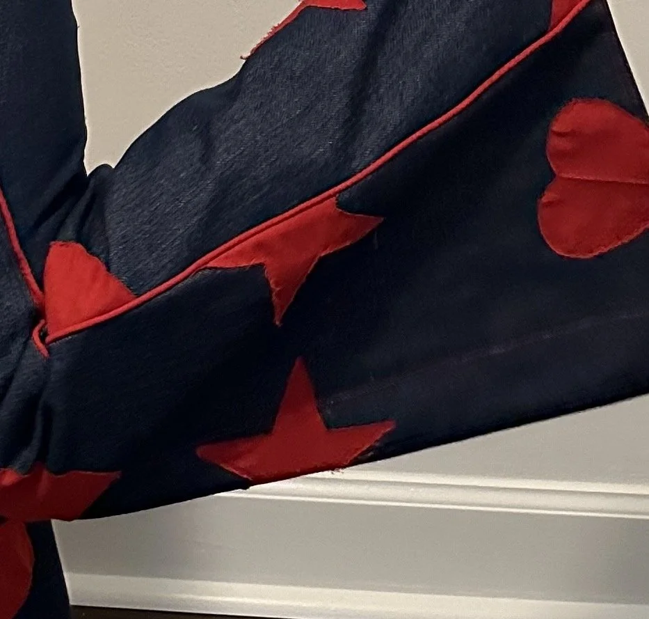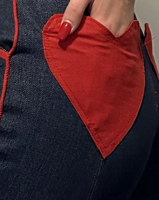 The top is a navy woven fabric that is cropped, have a high neckline with short sleeves. On every hemline it has a lettuce hem with white thread.The Pants are dark denim bell bottom jeans. There is red topstitching throughout the pants. The front pockets are angular and have red bias tape and red pocket lining. There is red piping following down the side seam on both sides. On the bottom half of the pants the are 6 red stars and 5 red hearts scattered around the bottom. The 2 back pockets are large red hearts.
