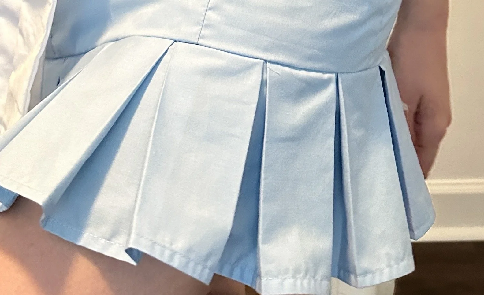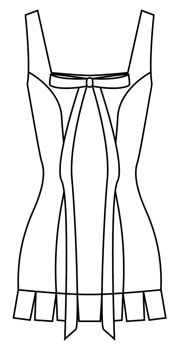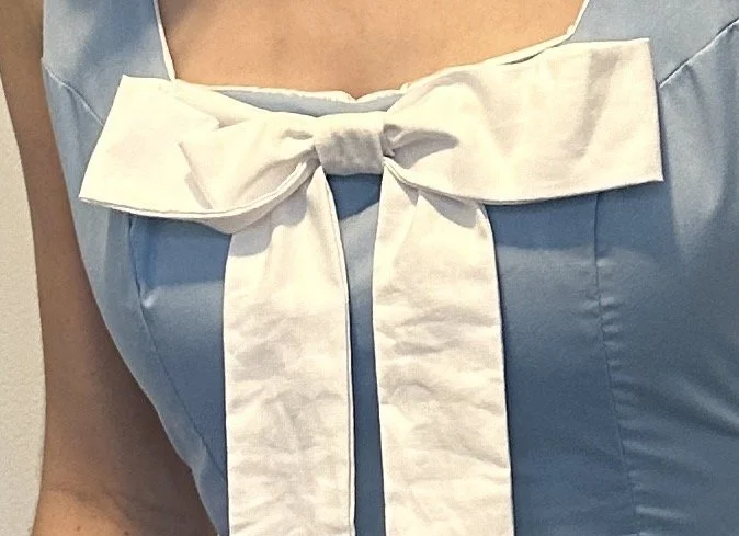 The dress is a blue sleeveless dress with princess seams going down the whole thing. the main part of the dress stops just below the crotch line and then there are a few inches of pleats below. The lining under the dress is white and stops with the main part of the dress. The neckline is a square neckline and right below the neckline there is a large white bow sewn into it, and the ribbon part of the dress drapes down to the bottom of the dress.