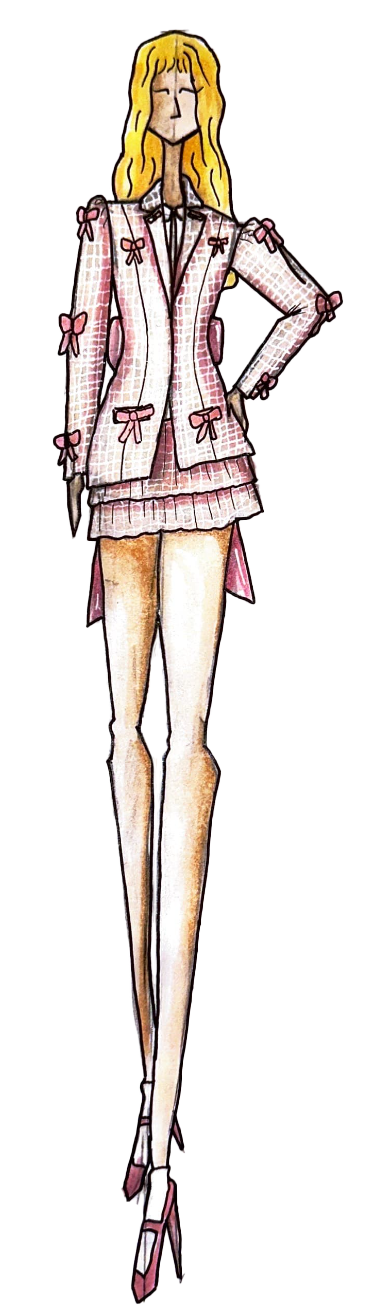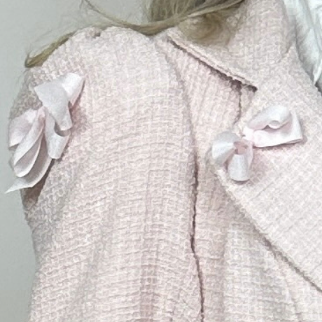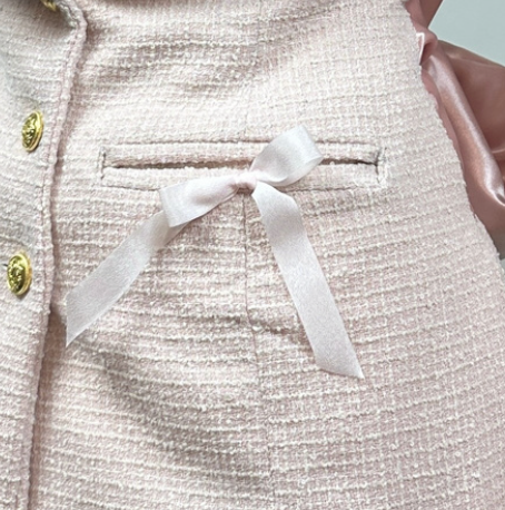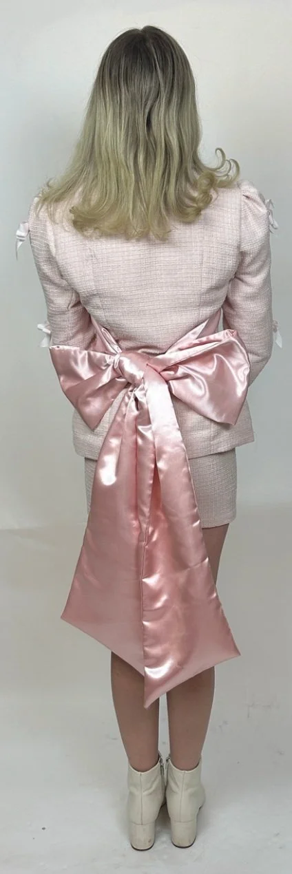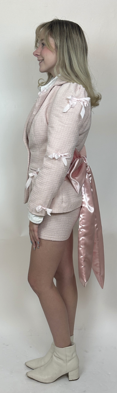 The “Bows for Life” Garment is an all pink suit jacket. The outer part of the jacket is made with 100% wool and the lining is 100% Polyester. The hem ends around hip length. There are Bows on the lapels and the double welt pockets that are just below the waistline. Along the sleeve there are three bows on each side spread evenly throughout the length. On each sleeve there is a faux vent with 3 gold colored buttons. The closure for the jacket are 3 gold colored buttons along the center.