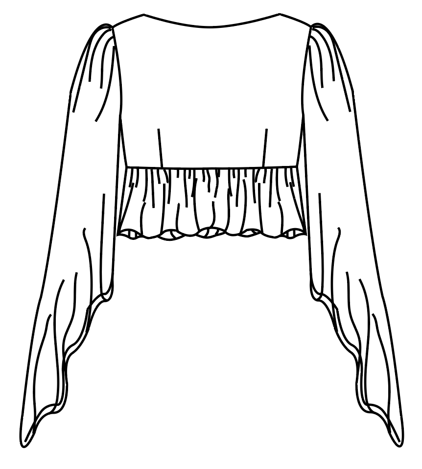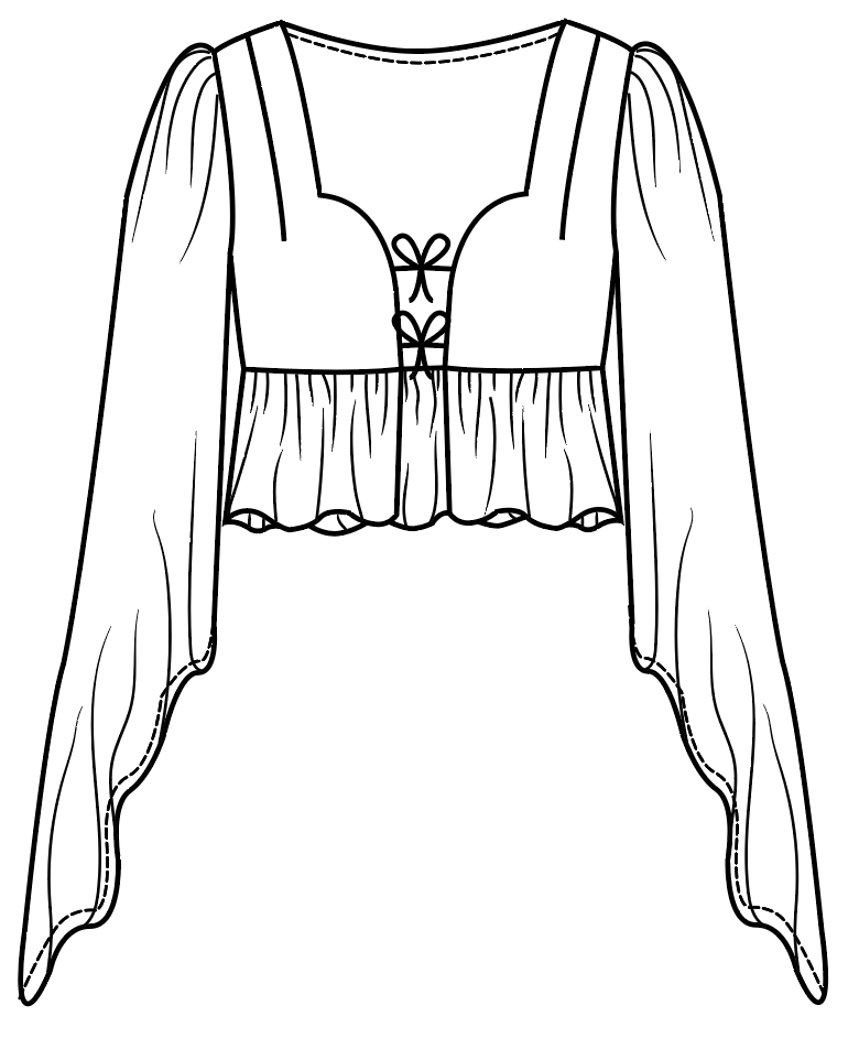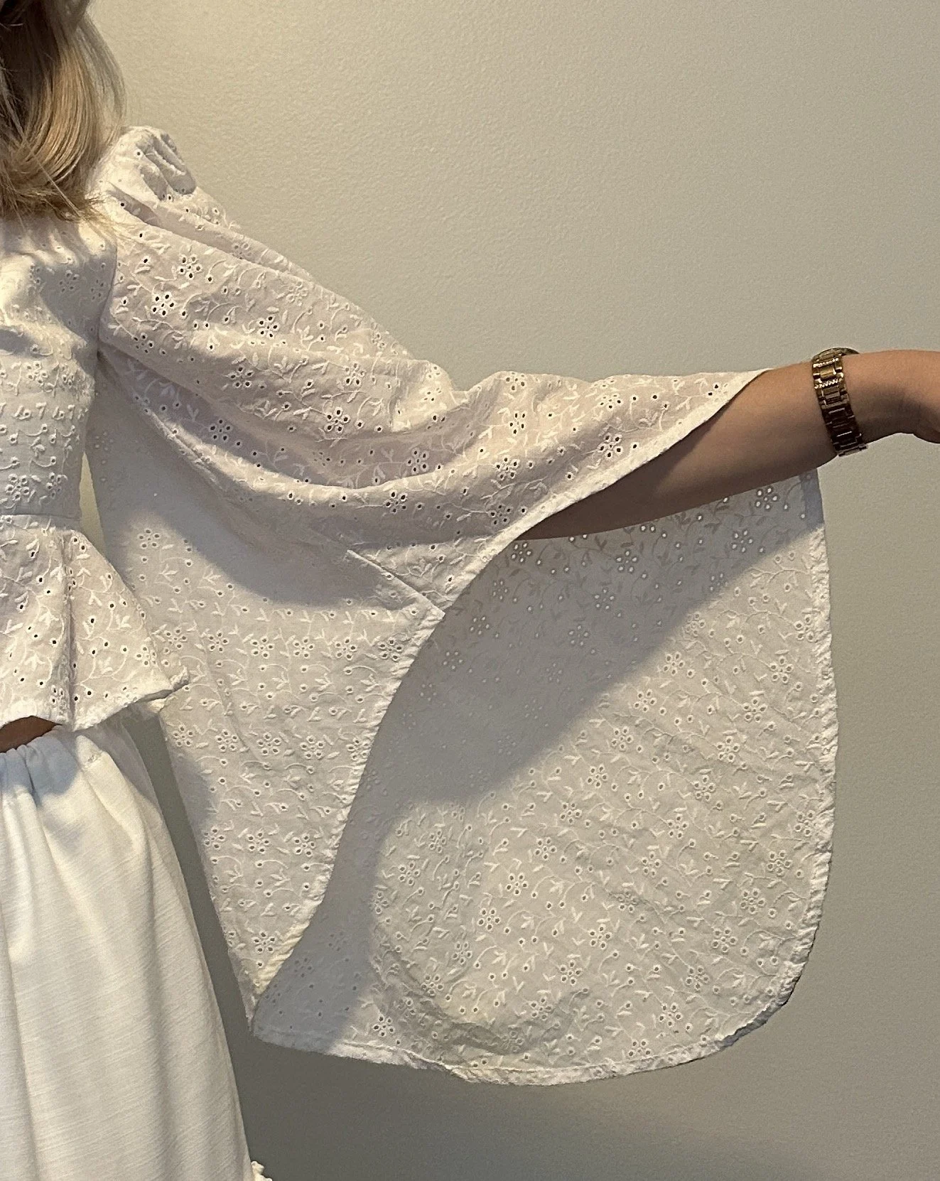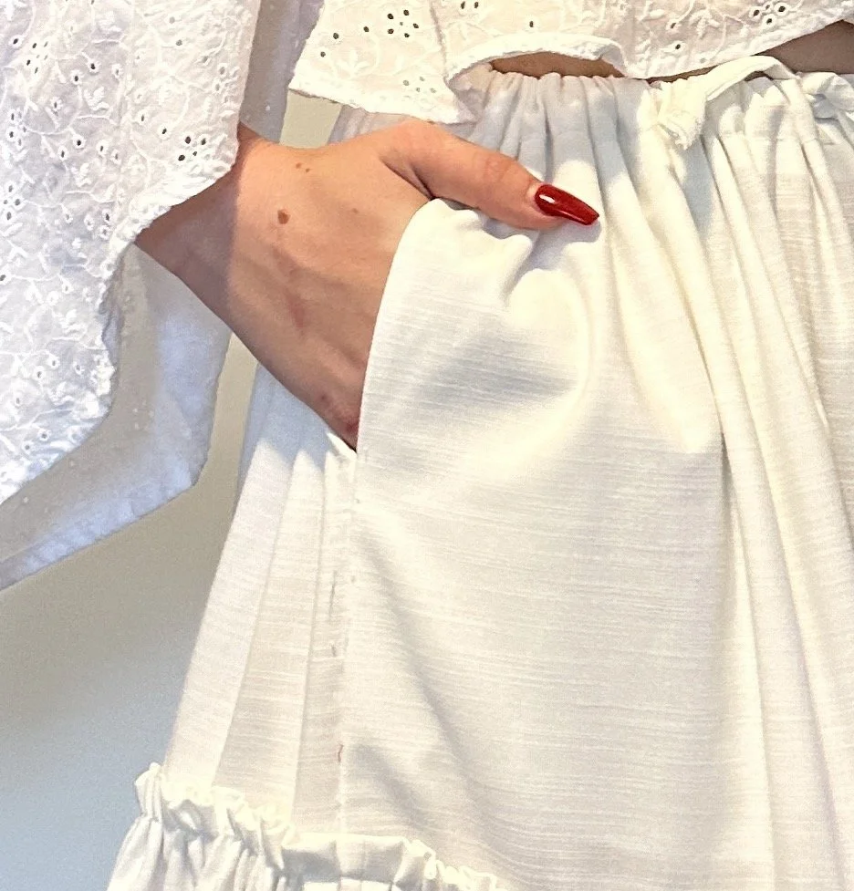 The top is a cropped white lace blouse. It ties in the front with two ties near the bust line. It has a square sweetheart neckline. The main part of the top is double layered and the bottom hem is a ruffled hem that is see through with the eyelet fabric. The sleeves are high to low bell sleeves with the high part starting around the elbow on the inside of the sleeve and the low ending a few inches below the fingers on the outward part of the sleeve.The skirt is a white tiered skirt that goes down to the mid calf. The waistband is a drawstring waistband and it has two large hidden pockets.